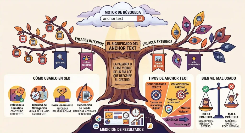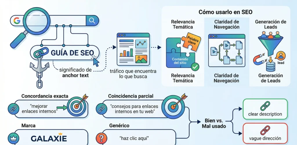 - El uso estratégico del anchor text en enlaces internos, externos y enlaces entrantes permite fortalecer la autoridad del sitio y apoyar estrategias de linkbuilding.