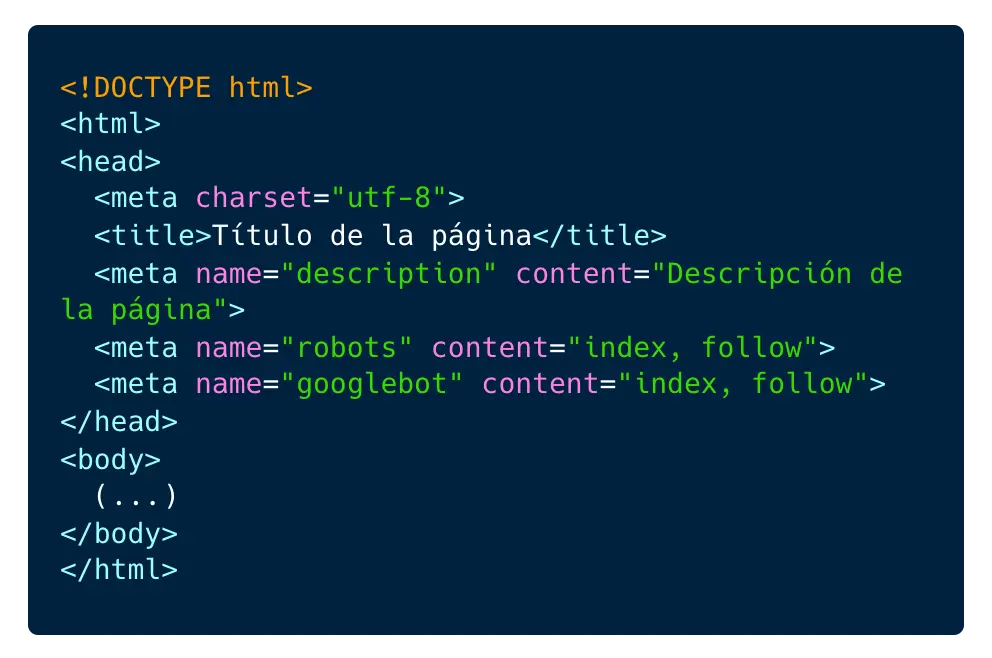 Las meta etiquetas SEO ayudan a los buscadores a entender información clave sobre una página. Un ejemplo común es: