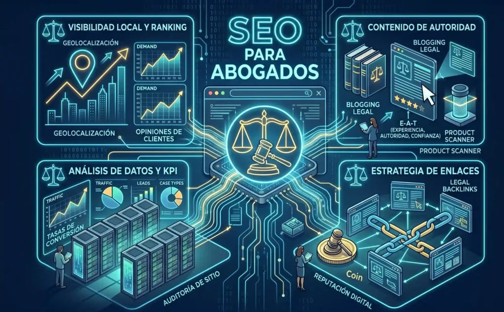 Es el mismo concepto aplicado al sector legal. Incluye estrategias adaptadas a servicios legales. Busca generar visibilidad y confianza.